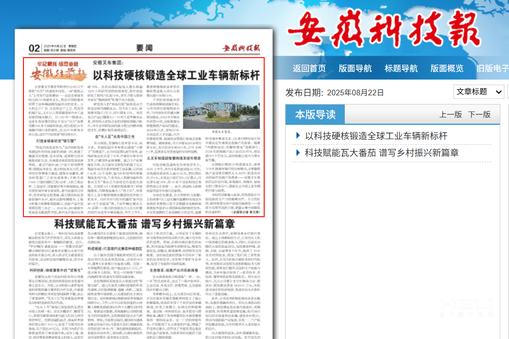 查看詳情 >【安徽科技報】安徽叉車集團: 以科技硬核鍛造全球工業車輛新標桿